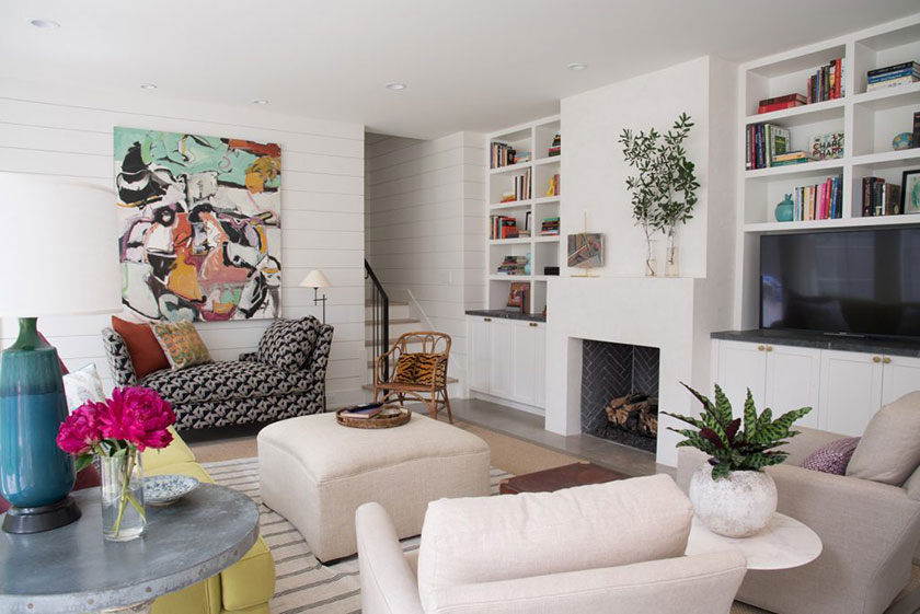 This photo of the same room shows how the simplicity of the plastered fireplace is architecturally important without competing with the large-scaled art! By mixing different textures of the same tone, interest and warmth are established without closing in a space. Love the stylized simple vases filled with greenery!