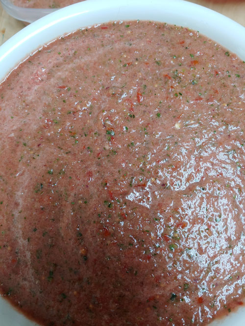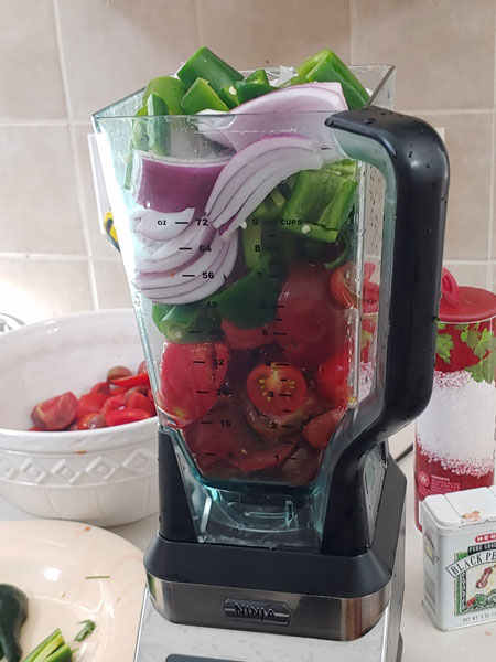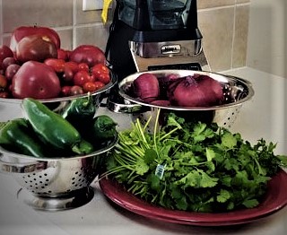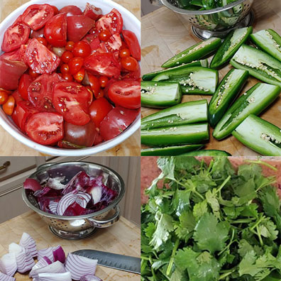 All you need is about a gallon of mixed tomatoes. Cherokee, Purple, Cherry, Big Boy, and heirlooms are great choices–just mix and match. Slice 7 seeded large Jalapenos, 1 Large Onion or 3 small red onions and Cilantro and salt to taste.
