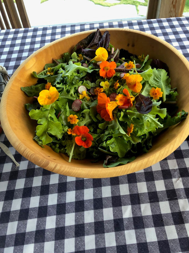 Even salads have become an art form. With their harvest of lettuce, kale, veggies, and the most beautiful edible flowers each child builds their own creation at dinner time. Mixing organic olive oils and artisan balsamic vinegar for dressings the family makes a point to comment on each taste. They call it their adventure in a bowl.