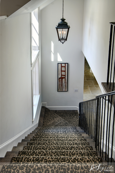 Even the staircase has personality!!! Getting inspiration from designer Blake Winston, a close friend, this leopard runner was added to liven up the stairs and hold up to kids and dogs. The painting by Houston artist Marthann Masterson who happens to also be the homeowner’s mother-in-law adds just the right amount of color!!! And the geometric lines of the chair in the painting carry over to the beautiful balustrades that the homeowner found at the Warrenton Antique Festival.