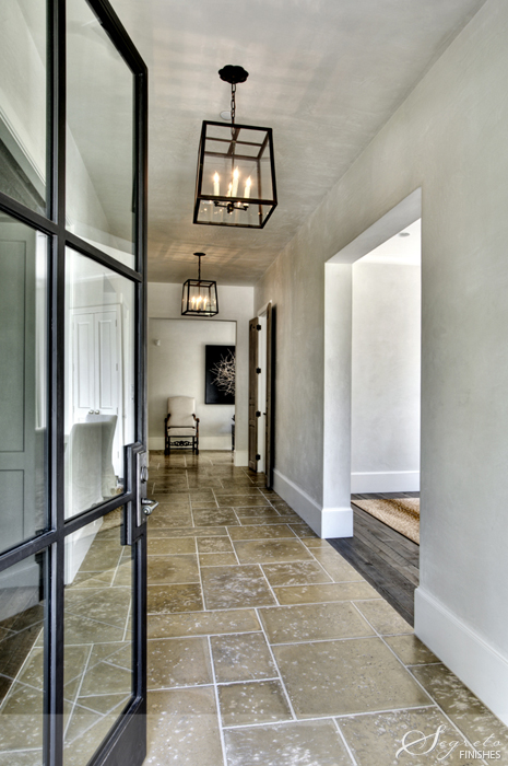 The entry hall has a great modern meets old world feel with these custom-made lanterns from Boxwood Interiors that echo the metal and glass front door. We plastered the walls and ceilings in the tone of the homeowner’s favorite white (Benjamin Moore “White Dove”). Though making a plaster this white proved challenging because plaster has a natural gray cast, I love the way that plaster made these tones warm. The rich medium brown flooring from Peacock Pavers out of Alabama also adds wonderful character!