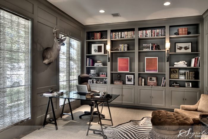 This study has such a fun, eclectic feel!!! The homeowner collaborated with her friend, designer Holly Hibbert, to come up with the thoughtful placement of accessories on the shelves. It creates an incredible focal point that draws you into the room. The two red paintings by Houston artist Van McFarland provide a great pop against the Sherwin Williams “Anonymous” painted built-ins and paneling. The different textures of the Conrad grass cloth shades and the layered rugs adds so much dimension! And I love the sawhorse desk from AREA!