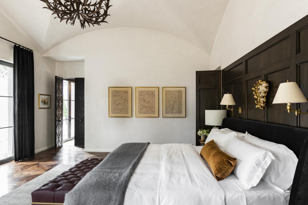 “The master bedroom speaks to me because it’s elegant and romantic with a groin vault ceiling and Rose Tarlow chandelier. I also adore the large walnut screen that surrounds the custom-made bed frame—a nod to the panelling seen throughout the home,” she says.