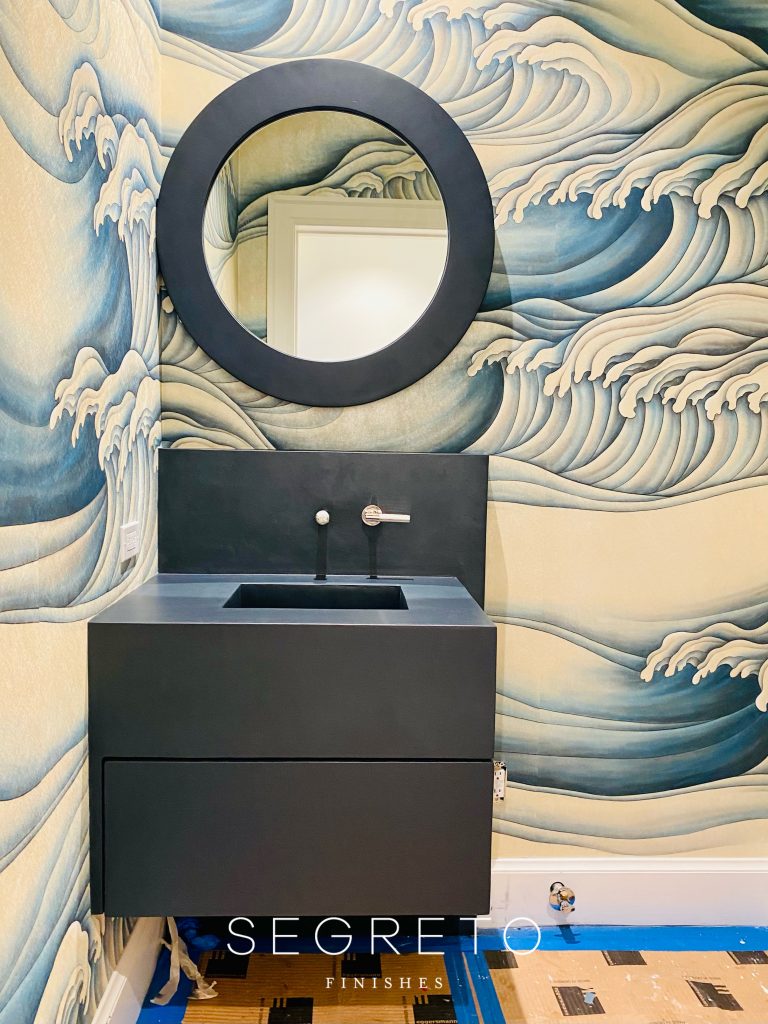 This small powder packs drama with its hand-screened paper and custom contemporary SegretoStone basin with integrated sink and mirror! The rich blue was taken from the most pigmented parts of the waves. Although we have 23 signatures colors, Segretostone can also be customized in your perfect shade. Builders West was instrumental in customizing the box we applied our SegretoStone on top of!