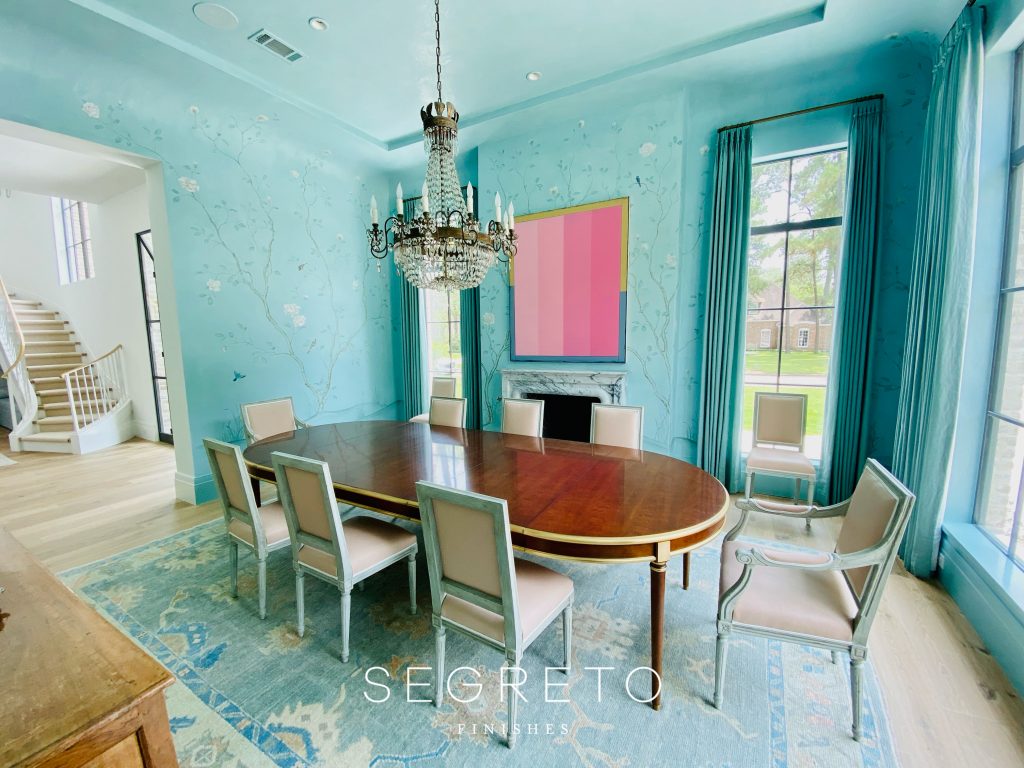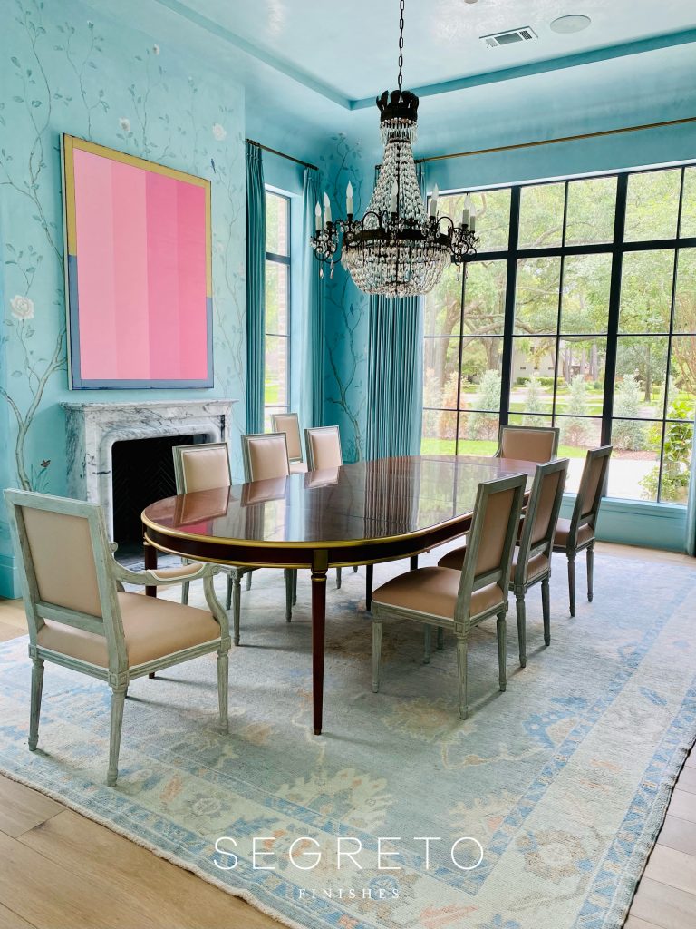 Designer Jennifer Martinez, a master of infusing color, created a a space all of its own in this dramatic dining. We loved the effect of our plaster formulated to blend with Farrow & Ball Blue, but when we then hand-painted a mural on top- this room became a WOW!