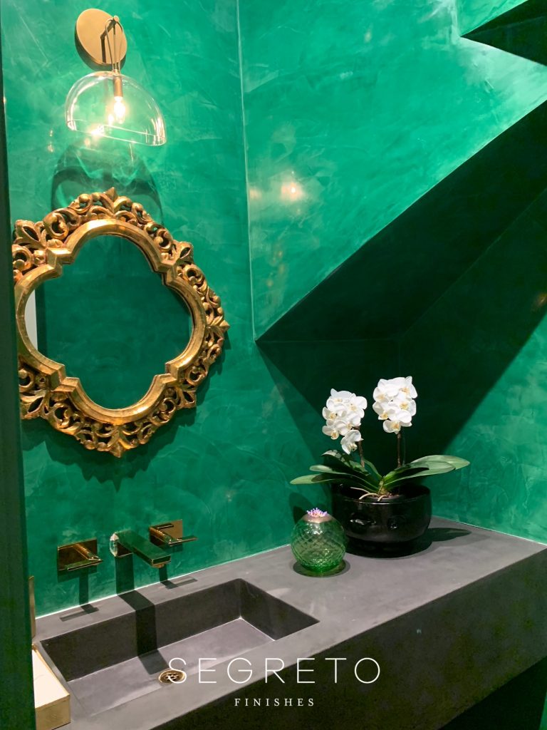 Daily Howard was a dramatic feel to her clients main powder. Using Benjamin Moore Cactus Green 2035-20 as inspiration, we applied a rich venetian on the walls grounded by a floating SegretoStone counter with integrated sink in our color Onyx.