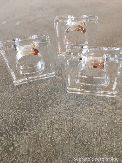 I found some vintage Lucite napkin rings on Etsy for a very reasonable price but there are also sources on Amazon.